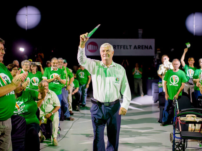 Pictured above: FF Plus leader Dr Pieter Groenewald during the party’s election manifesto launch in Heartfelt Arena, Pretoria on Saturday.