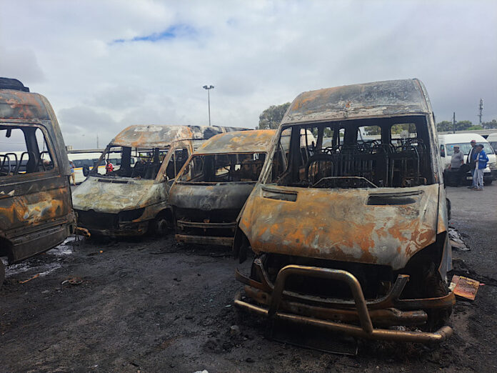 Five Toyota Quantum taxis were completely burnt out in the attack. Four Iveco Sprinters were damaged but not badly and have already returned to work.