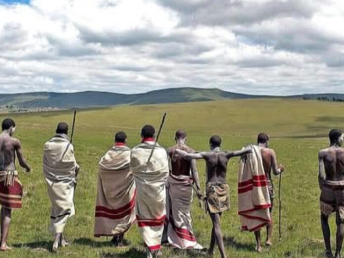 Pictured above: Traditional Xhosa initiates walking on a field.