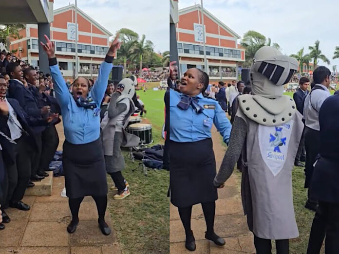 Pictured above: Northwood Boys High School’s front gate security guard, Anathi, sets social media abuzz as she leads the boys in a traditional celebration during the rugby game.
