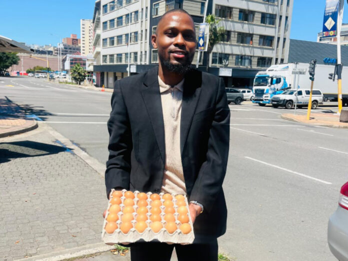 Pictured above: Mfundo Mngadi, a Durban lawyer who sells eggs to make ends meet.