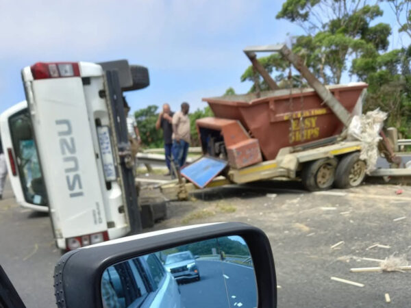 Pick-up bakkie with skip bin trailer jack-knifed on R61 between South Coast Mall and first toll gate off-ramp. Emergency services attending the scene.