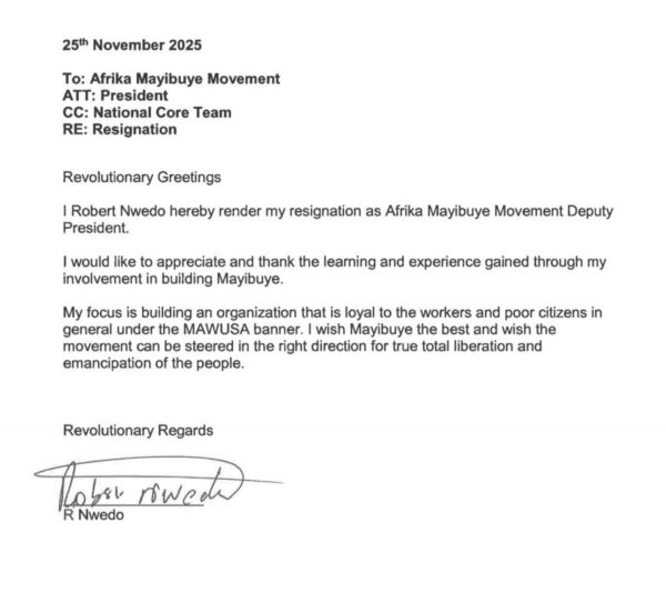 In his official resignation letter dated 25 November 2025, Nwedo writes: “I Robert Nwedo hereby render my resignation as Afrika Mayibuye Movement Deputy President.” He continues: “I would like to appreciate and thank the learning and experience gained through my involvement in building Mayibuye.”