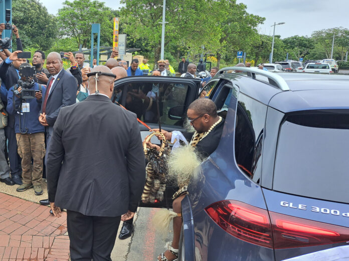 Pictured above: King Misuzulu KaZwelithini arrived at King Shaka’s statue unveiling chauffeured in a Mercedes Benz as his Range Rover had not yet been fixed after the road accident he escaped unharmed.