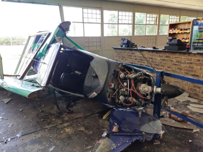 · A light aircraft crashed into Hoërskool Alberton’s tuckshop during an emergency landing, but both the pilot and instructor walked away unharmed.