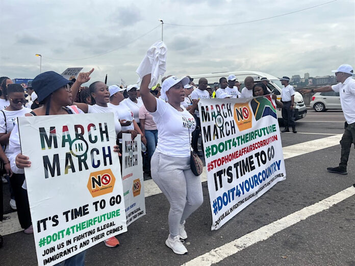 Pictured above: Zulu and Xhosa communities march together in Eastern Cape to protest against the alleged Nigerian king.