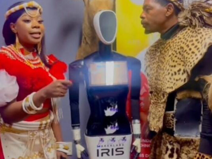 Pictured above: AI Iris robot innovator Thando Gumede and one of the Zulu regiments Thulani Nkwanyana during the introduction of Iris at the Reed Dance in Phongola on Saturday.